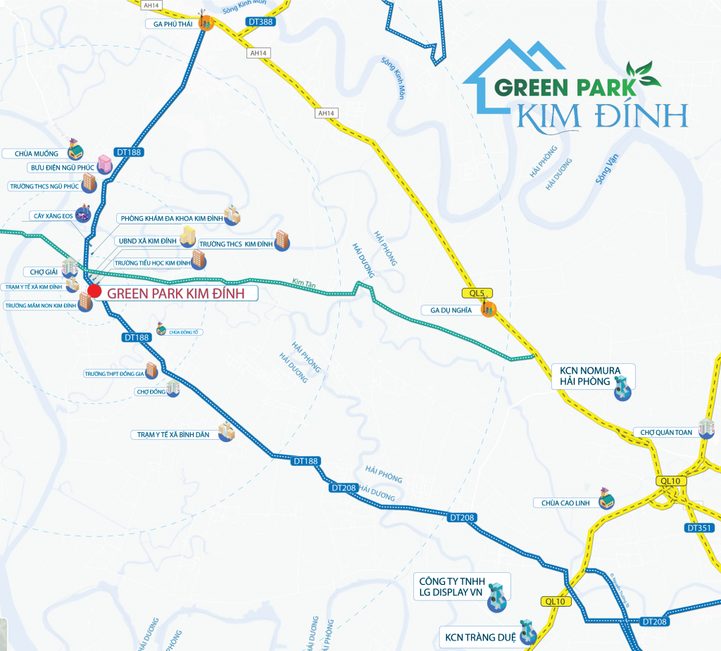 Với vị trí đắc địa, ôm sát tuyến giao thông huyết mạch QL17B, Green Park Kim Đính sở hữu vị trí “VÀNG” kết nối các tuyến giao thông quan trọng đến các tỉnh thành phố lân cận Hải Phòng – Hải Dương. Đồng thời, di chuyển thuận tiện đến các KCN lớn như KCN Tràng Duệ, KCN Nomura…